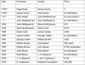 It is not at all clear from the deeds when the current buildings were erected. Some of the deeds of 1818 refer to James Hoyes buildings in the present tense, and the huge increase in value from 1818 to 1838 indicate that George Wood and John McHendry may have considerably improved the land. However, there is then a dramatic fall in price by 1855, and the value remains relatively constant with inflation to the present day. The question this leaves us with is – was David Clark the purchaser of new buildings which he allowed to fall into disrepair, or was he simply a bad judge of business opportunities who paid over the odds for the land, and then sold it at a loss?