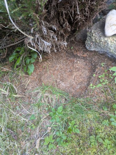 I looked in the Universal Hall Sanctuary, then in and around the Light of Findhorn Sanctuary as someone said they had heard it had been moved there, not actually knowing that it was this rock, the large stone that had sat by the low wall under the evergreen tree for at least the last five years. Look at the depression left in the grass; not just a casual stay. Though who had put it there, and why, it was hard to tell. It did indeed look dumped, hidden by its very ordinariness, especially once the exposed side grew weather-stained.