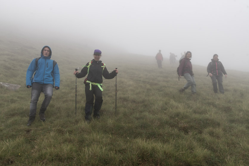 We continued our walk. The ridge became wider and soon we all lost our sense of direction. Completely. Utterly. Deep fog. We came to a halt. People started suggesting which direction to go, pointing. Alarmingly, each pointed in an entirely different direction. Discussion arose. One person tried to create order in this chaos by suggesting we would choose our direction by majority of vote!