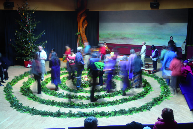 At Findhorn we celebrate these Celtic festivals, and at the time of writing we have passed the time of the longest darkness (the Winter Solstice) which the Community marks with a Solstice Spiral and meditation. Now we are moving towards Imbolc on February 1st. At Imbolc we experience mythical and natural time in the marking of the season of the ewes coming into their mother milk, in preparation for the spring lambs. As the earth slowly warms, we celebrate the Feast of Bride, or St Brigit, and welcome Bride in as the goddess of the land in her maiden aspect. Celtic legends of her as the midwife for Mary and nurse of the Christ Child lead her to be known as the Mary of the Gael.
